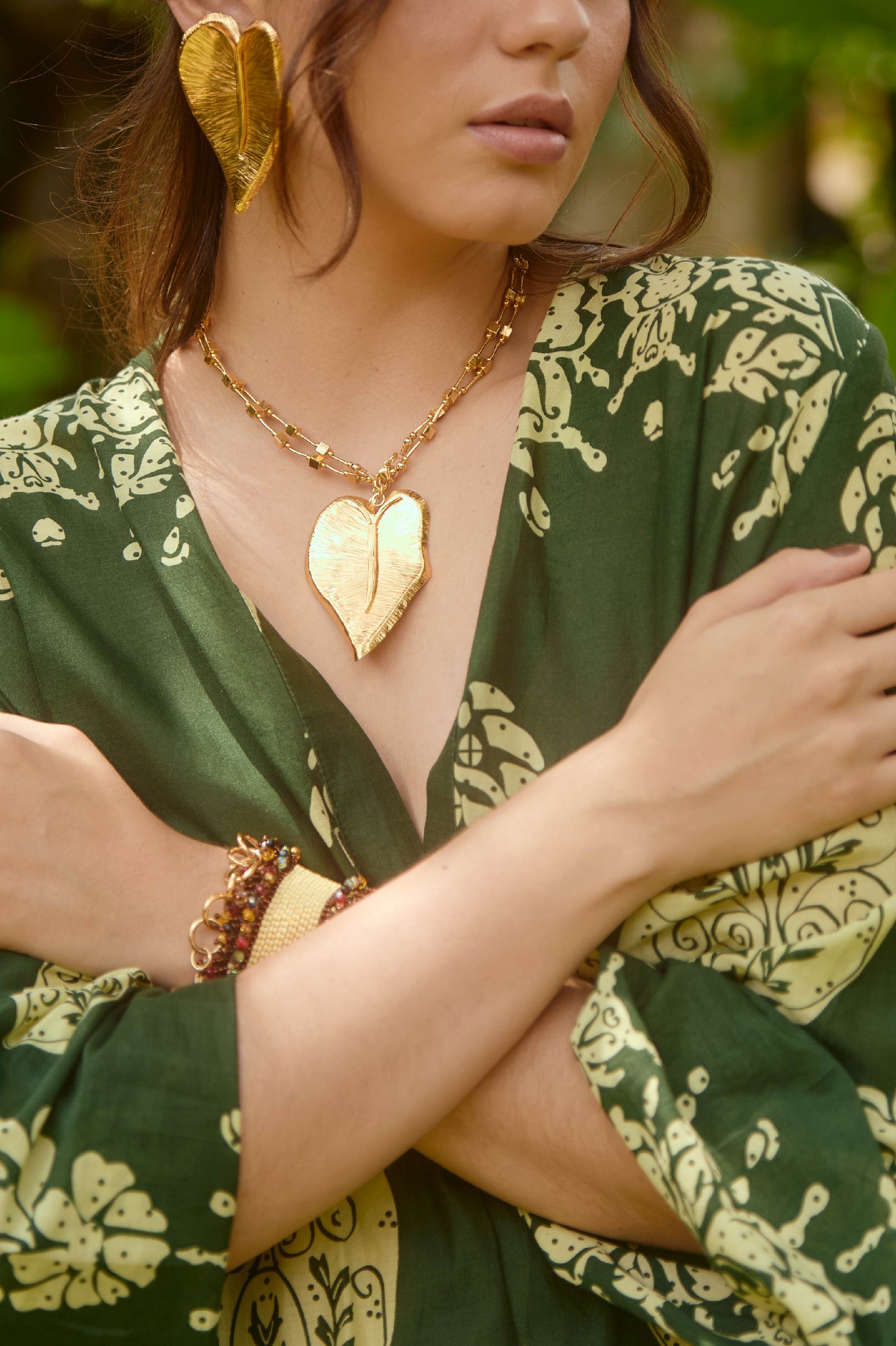 Cadena larga en bronce con dije Arturio, acabada con recubrimiento de laca cataforética y baño en oro de 24K.