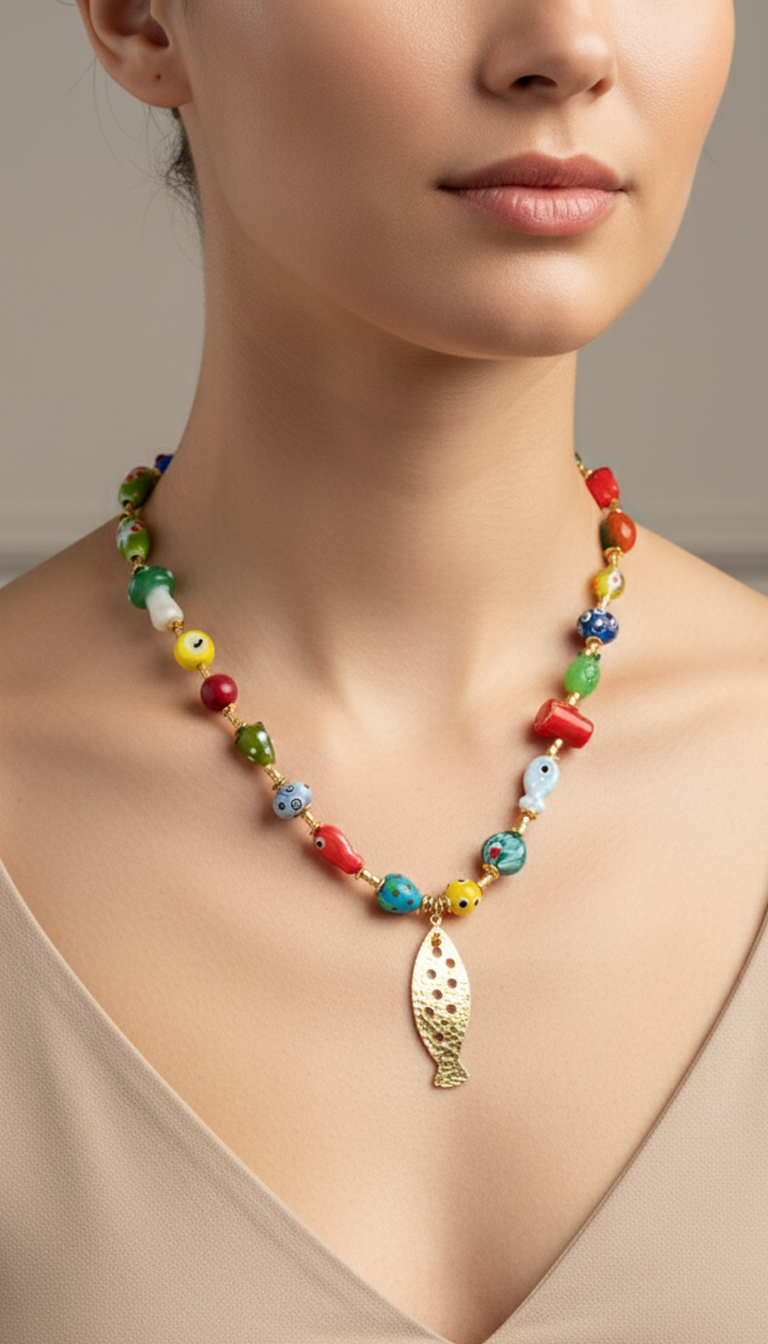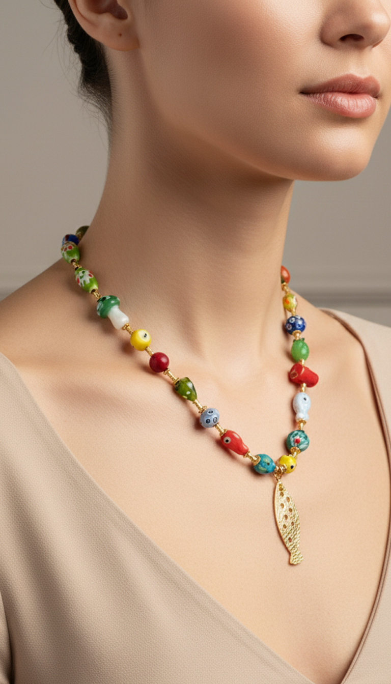 Collar con piezas de vidrio fundido y coral. Elaborado en bronce con baño en oro de 24K y recubrimiento de laca cataforética.